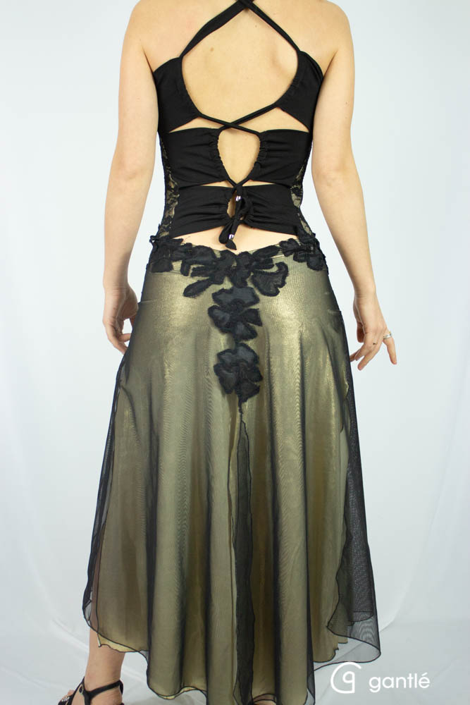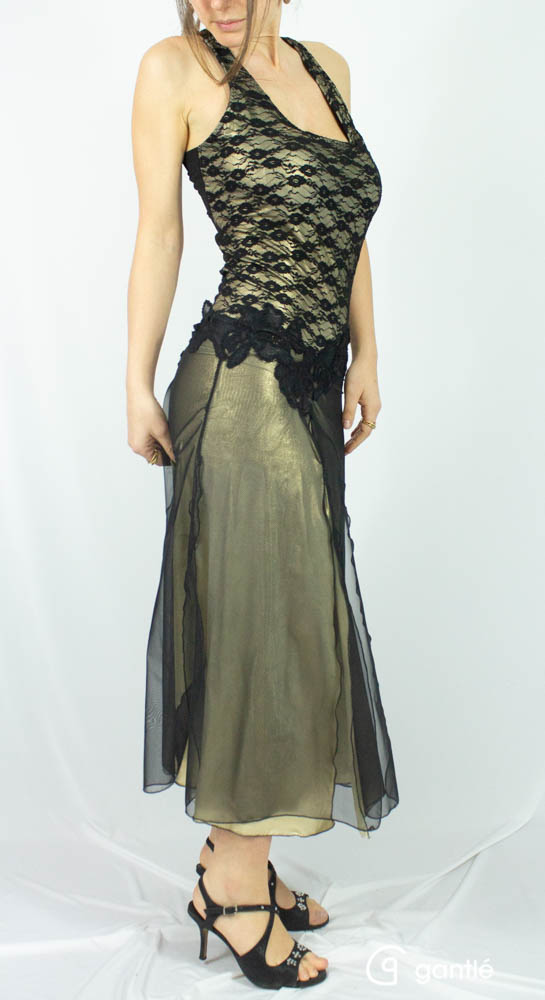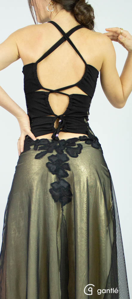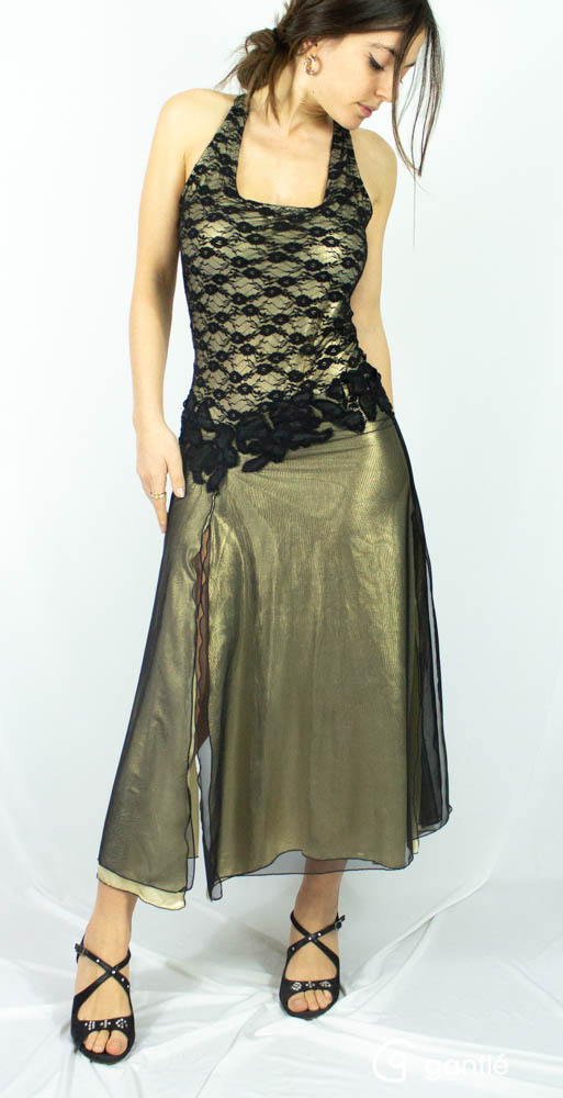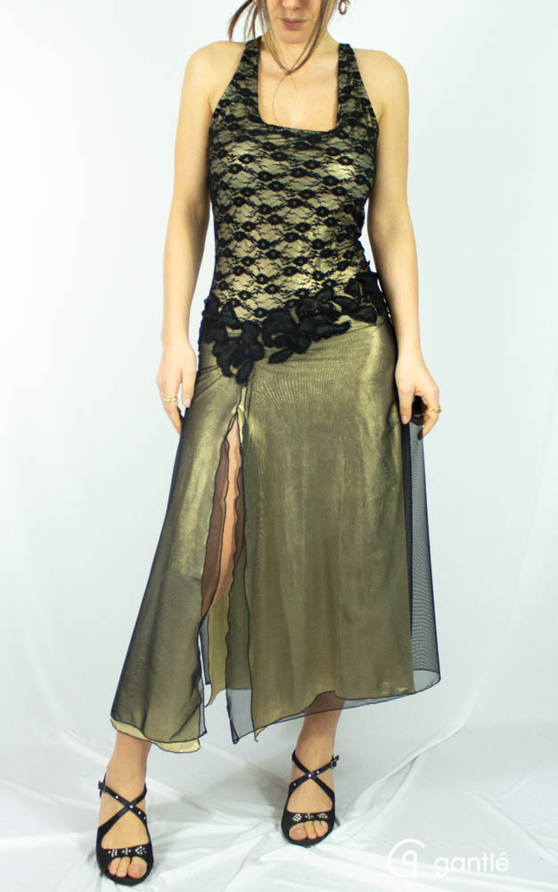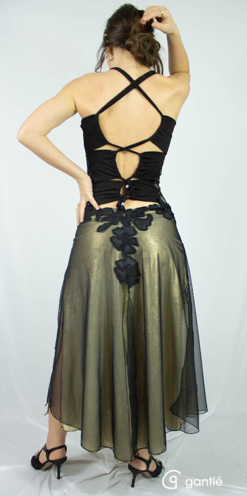 La gonna in lycra oro e tulle nero è aperta davanti, dietro e sui lati.